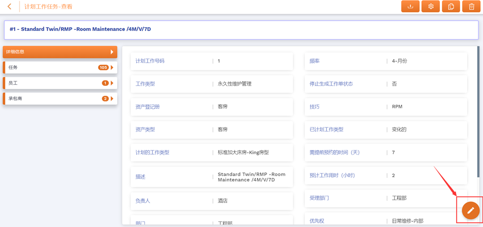 维保工作 – 比如总经理需要总工对新购买的制冷机组安排维保工作。 维保工作 系统已经自带了众多的维保工作。酒店可以直接使用列表中的维保工作。 或者 酒店管理者可以为需要他们检查的设备创建维保工作。 首先,点击“补充“,如下图。 接着填写所需的部分,如下图所示。 根据到期日和日期提示时间,系统生成工作单。 通过 ‘就业行动‘模块完成工作单。