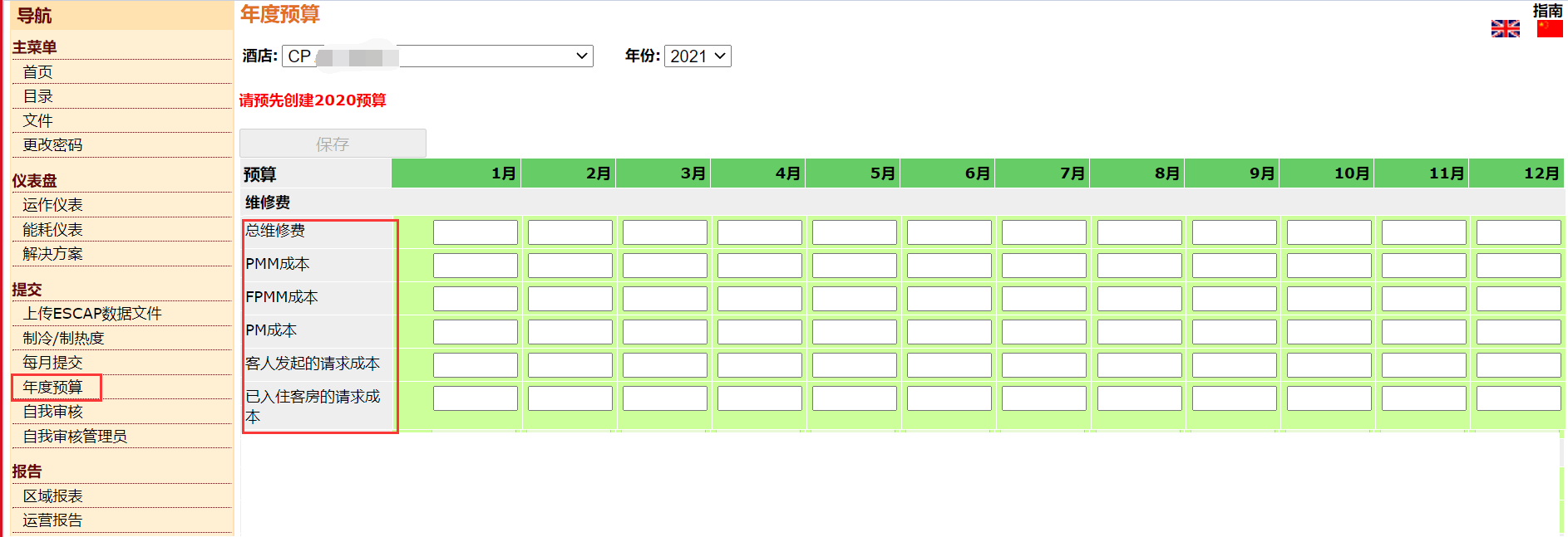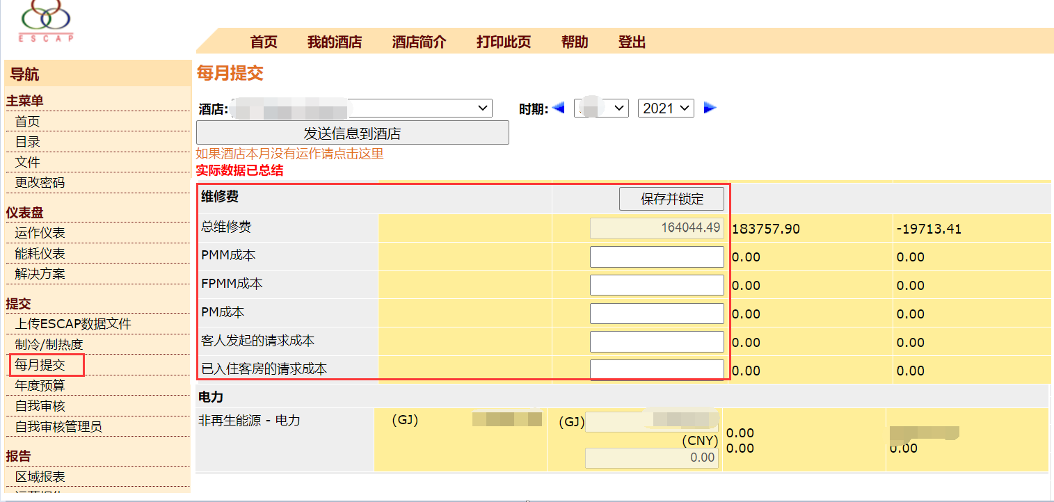 注意:只有当能源数据从本地系统提交/发送成功后,Portal中POM成本输入区域才会变为可编辑状态,酒店用户才可以输入POM成本。