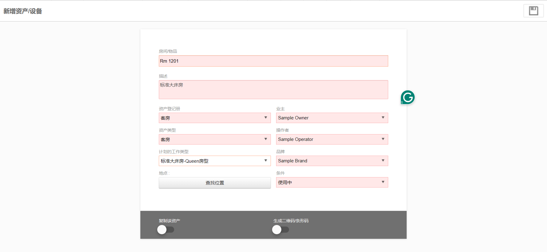 资产被定义为需要主动维护或计划维护的任何项目。当涉及到客人的房间时,房间里的所有物品都按照工作单的描述来处理。直接录入客房作为资产即可。