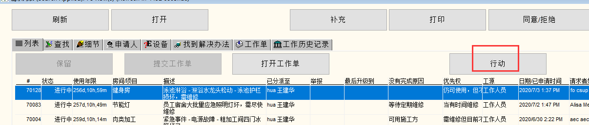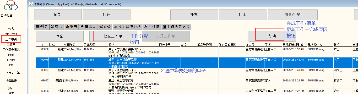 登陆ESCAP系统,点击左侧“工作申请”,列表显示所有未完成的申请单。选中要处理的单子,点击相应按钮,即可进行相应的操作。