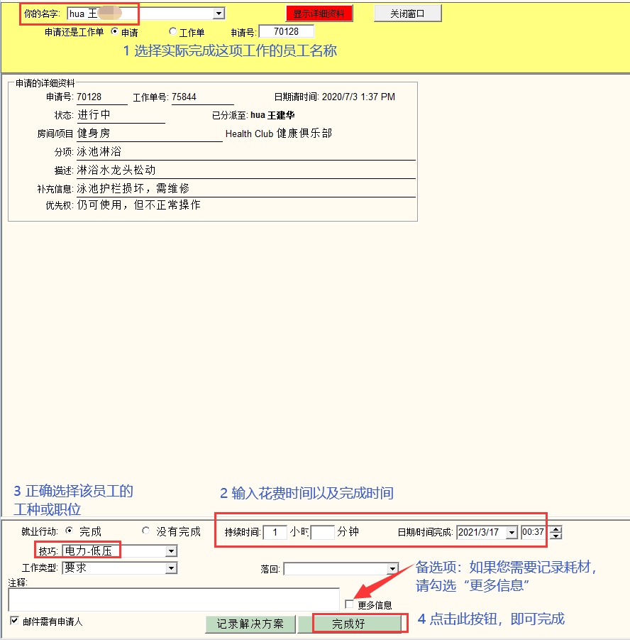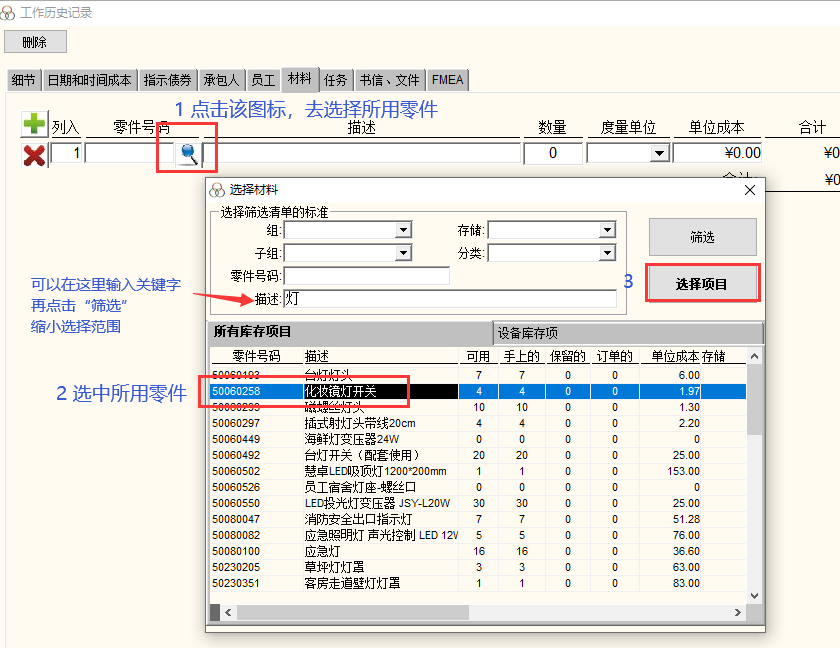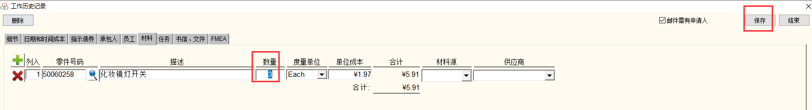 如果您勾选了“更多信息”,系统会跳出另外一个窗口,您可以切换至“材料”项,点击添加按钮,选择所用零件,输入数量,最后点击保存,即可记录耗材。