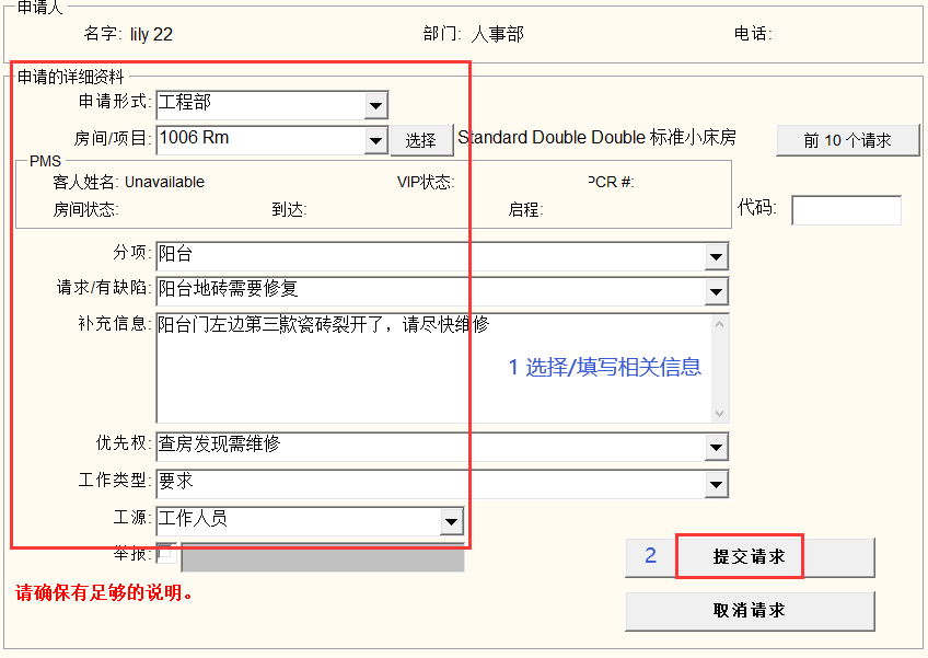 请求/有缺陷:申请内容/报修问题