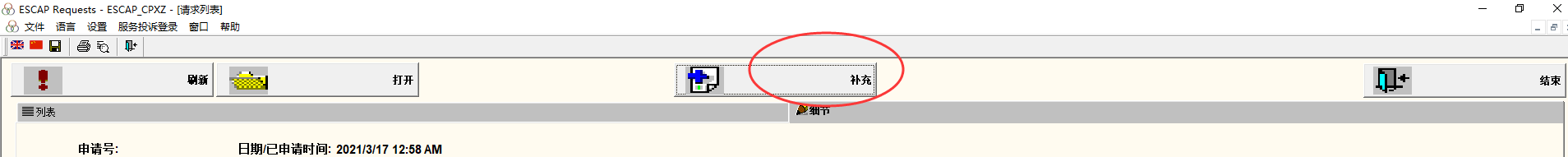 2 点击“补充”,打开申请单表格。