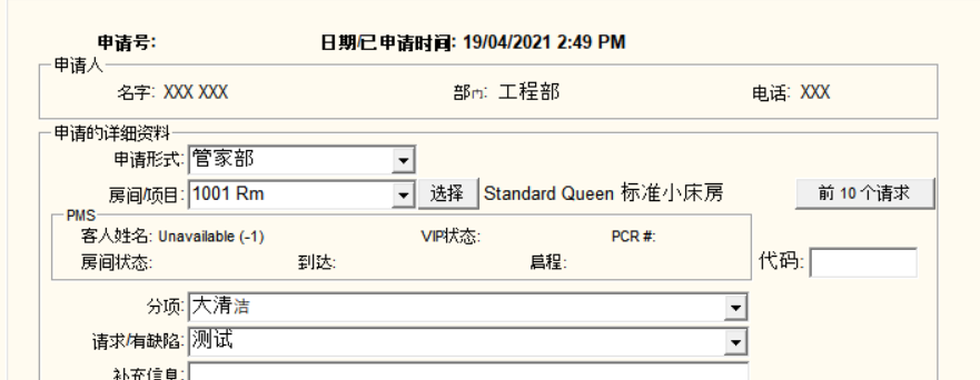 申请单 – 比如:客人需要客房部员工清洁他们的卫生间
