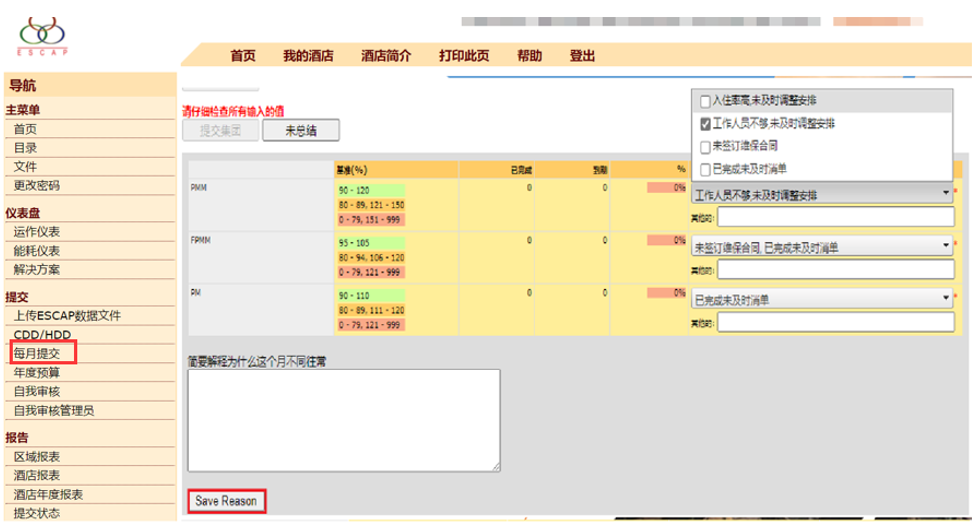 2.2 如果酒店任意一项工作没有达到绿色基准值,登陆后,系统会将登陆用户引导至每月提交页面,并显示一条信息“必须填写未完成原因(PMM, FPMM, PM)”。
