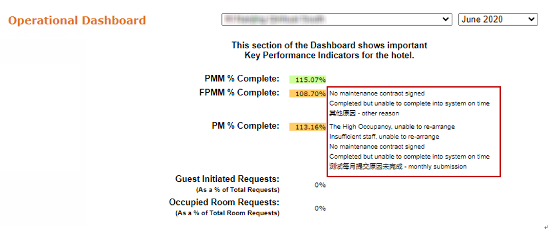 3.2 如果酒店任意一项工作未达到绿色基准值,只有提交原因后,用户才能查看Portal中的运作仪表或酒店报表,并且提交的原因会显示在运作仪表中相应的工作类型旁。