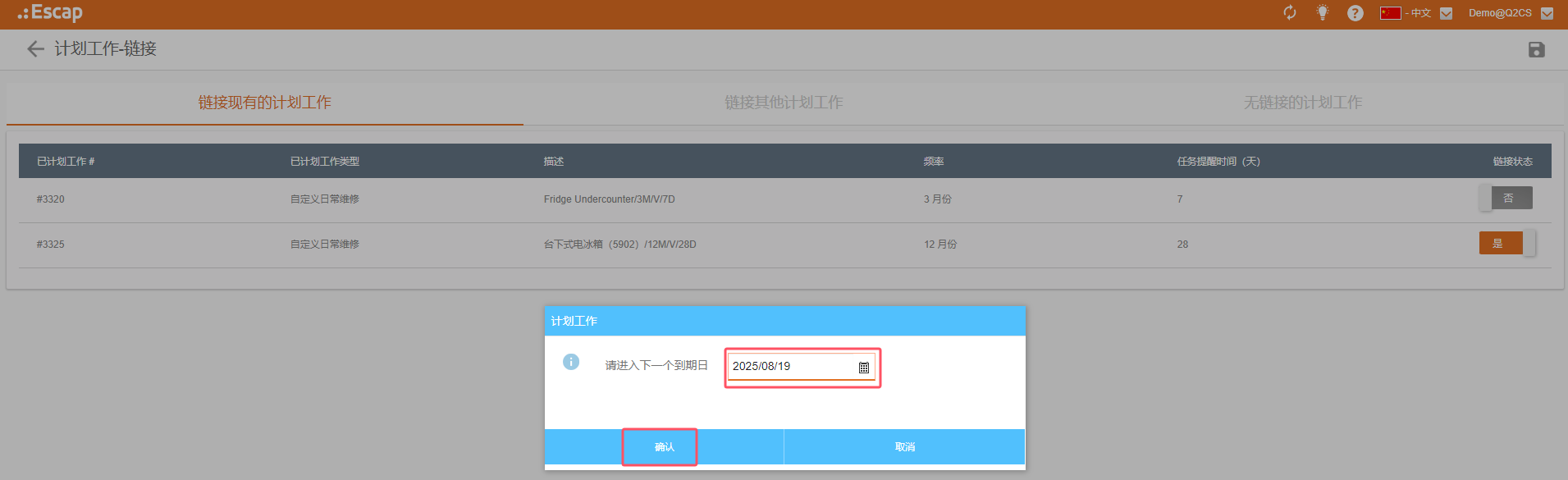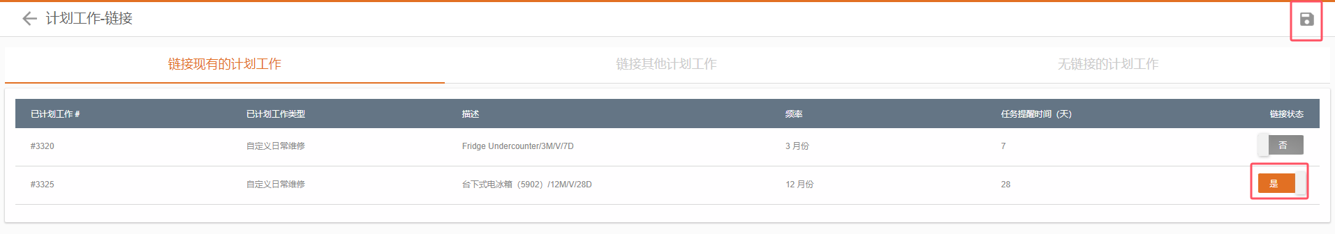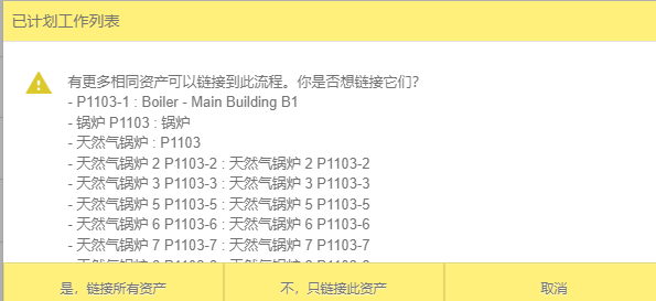 第一个标签页会显示最适合所选资产的维保任务,第二个和第三个标签页是与其他资产相关的维保任务