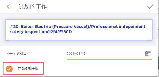 如果系统中有同类资产,您将看到“自动负载平衡”的勾选框。有了这个勾选框,您可以一次性批量的将所选的维保任务链接到所有同类资产中,并确定每个资产的到期日。