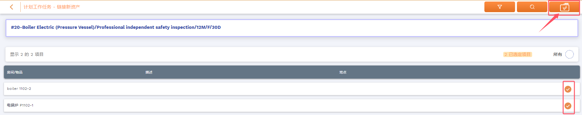 打开的窗口会显示与维保任务有着相同的计划工作类型的所有资产