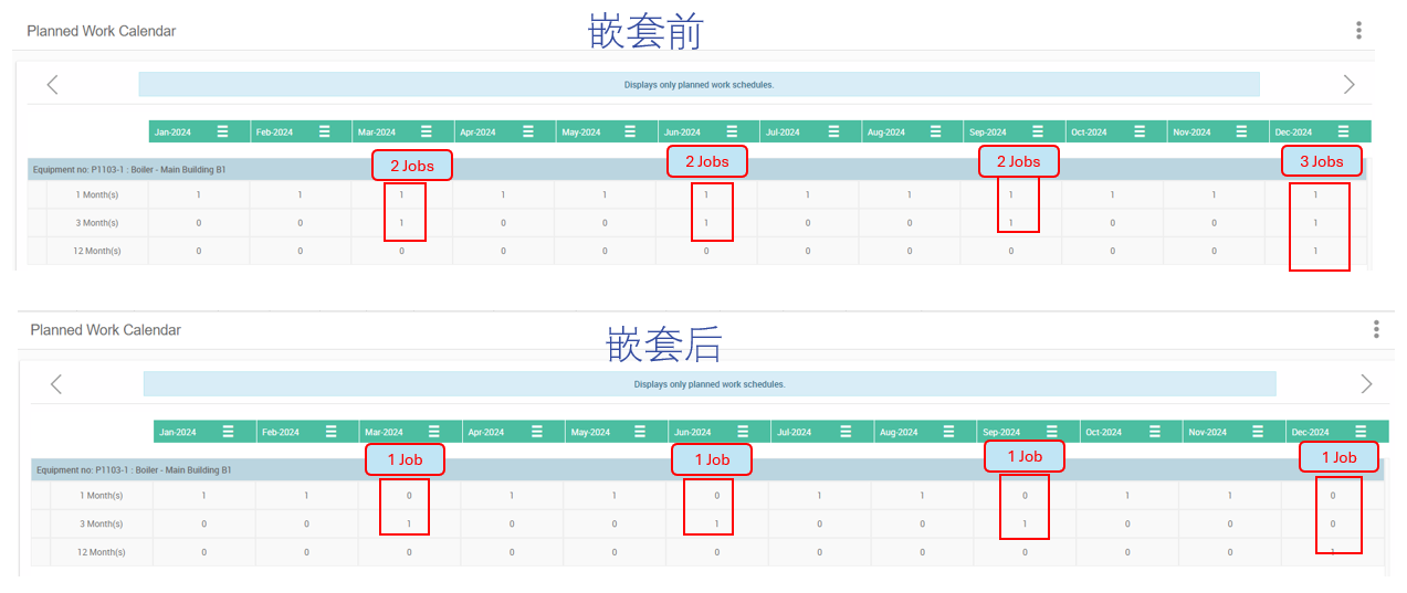 假设,您给锅炉链接了1个月、3个月和12个月的维保任务。嵌套前,在某些月份,同时有两个或三个检查到期。这意味着,同一个工作会有两个或三个工作单,这不是您想要的,因为每12个月的检查包含了每3个月检查的内容,而每3个月的检查又包含了每1个月检查的内容。