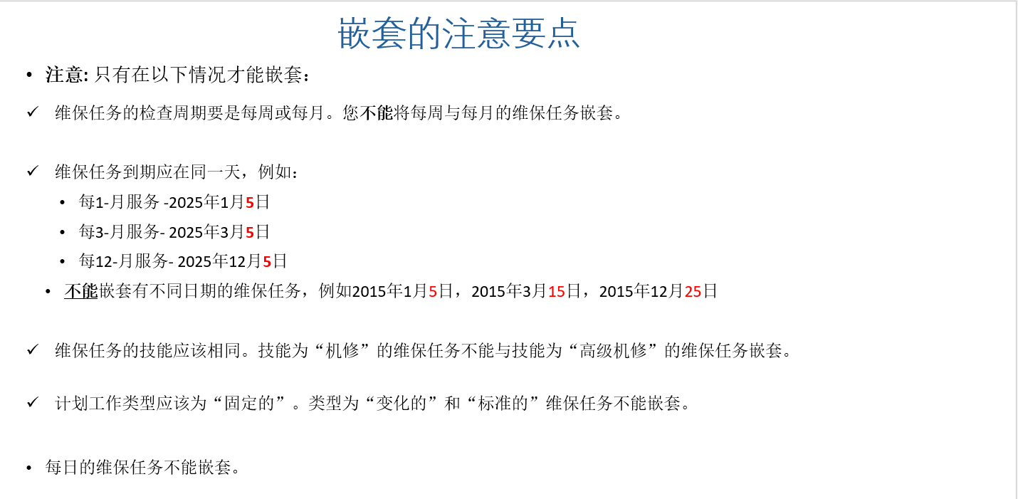 只有拥有相同频率类型,相同的日期,相同的技能以及计划工作类型为“固定的”维保任务才能嵌套。