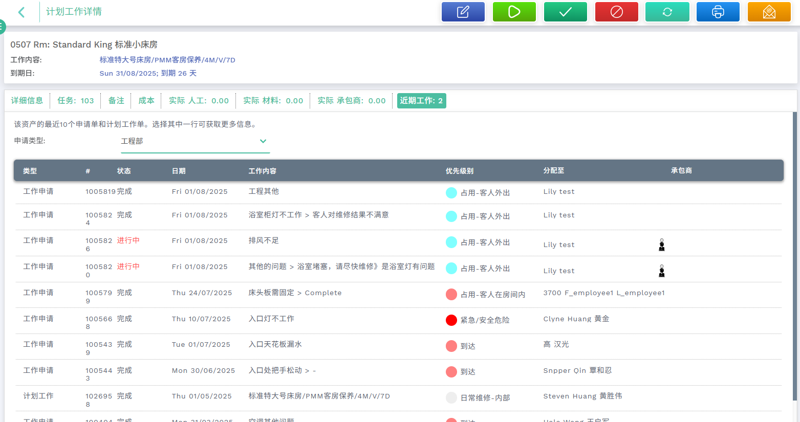 员工姓名列表现在会显示分配给每人未完成的申请单数量及未完成的计划工作单数量。