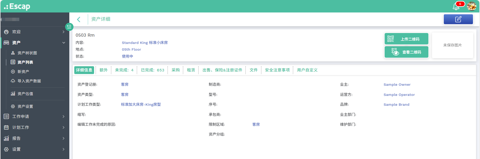 - 顶部摘要栏:集中展示资产位置、状态、照片等常用信息