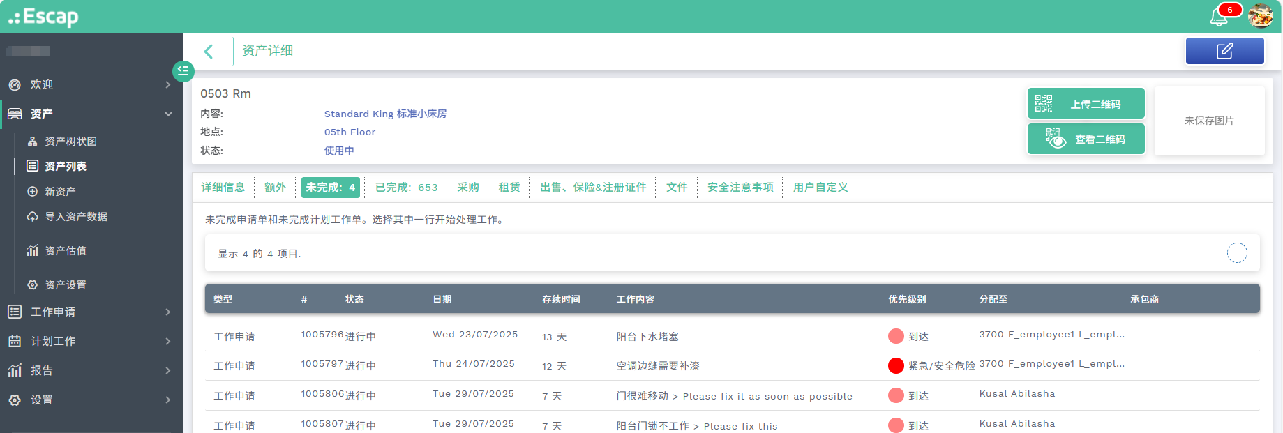 - 工单管理:查看该资产及其子资产的待处理工单与已完成工单信息