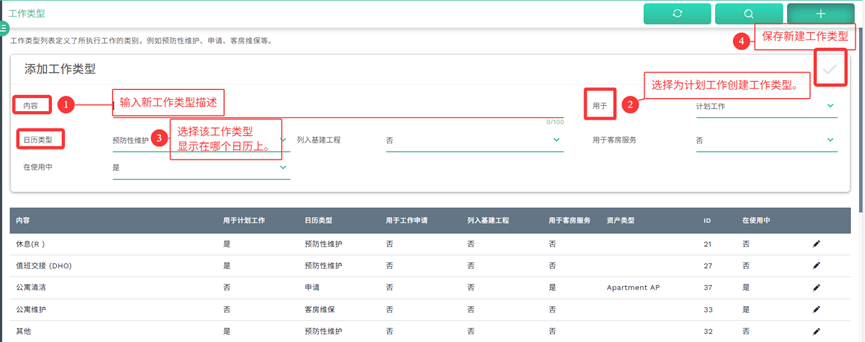 用户可以为维保计划创建新的工作类型,并添加至FPMM/PM/PMM日历中。