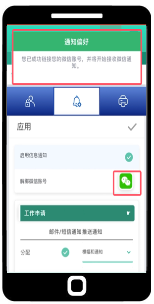 3.5 上述操作后,返回ESCAP系统,您会看到链接成功信息,微信图标变绿,表示绑定成功。